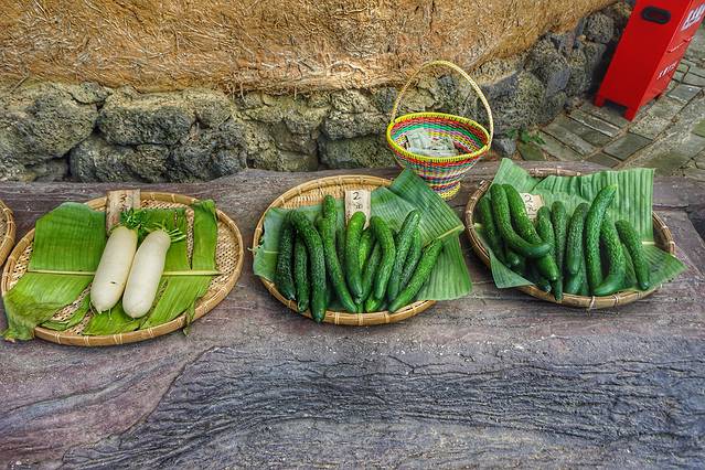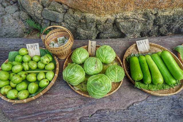 黎族村寨的村民会把家中多余的瓜果蔬菜摆放在村口,傍晚村民农忙回来再取回家。因为民风淳朴,所以不需要看管,行人自取,零钱放入小篓。