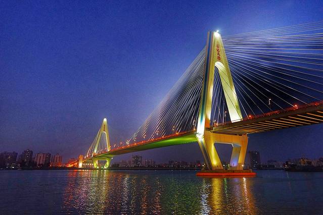 夜色渐深,大桥也亮起了灯,流光溢彩,这事确实是观赏世纪大桥的最佳角度。