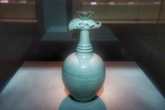 镇馆三宝之三:宋青白釉花口凤首壶。青白釉又称影青瓷,是指釉色介乎于青、白二色,青中泛白,白中透青的一种瓷器,宋代景德镇烧制而成。此壶的造型受唐代波斯金银器影响,胎质洁白细腻,釉色白中泛青,晶莹透体,凤头美如琢玉,存世量极为稀少。
