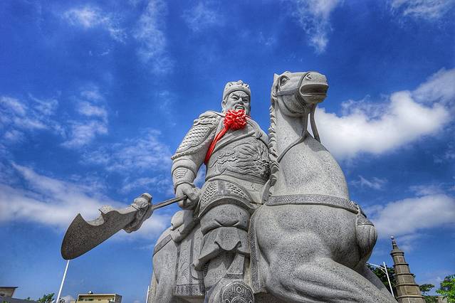这就是有着五百年底蕴的关帝庙正殿,大殿两侧廊柱的对联是:单刀会鲁肃秉烛观青史勇儒兼备;匹马战兀术奉母刺血书忠孝双全。上联是歌颂关公,下联却是赞美岳飞,原来这里初建为关帝庙,1915年增加岳飞合祀,称为关岳庙。