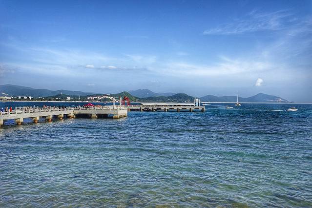 大东海有一个浮桥码头伸入海湾,景色特别美,离游客扎堆的沙滩有一段距离,但也并不是很远。