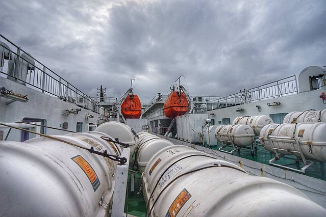 甲板上面站满了人,在围观汽车开进轮渡。从这里开进去的感觉有点像赛车运动员入场的感觉,就差没有欢呼声。