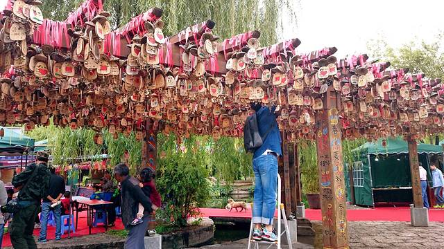 东巴许愿铃,草帽下面挂着铜铃,铜铃下面系着木牌,木牌上有东巴象形文,代表着祝福.我们当然要挂一个.
