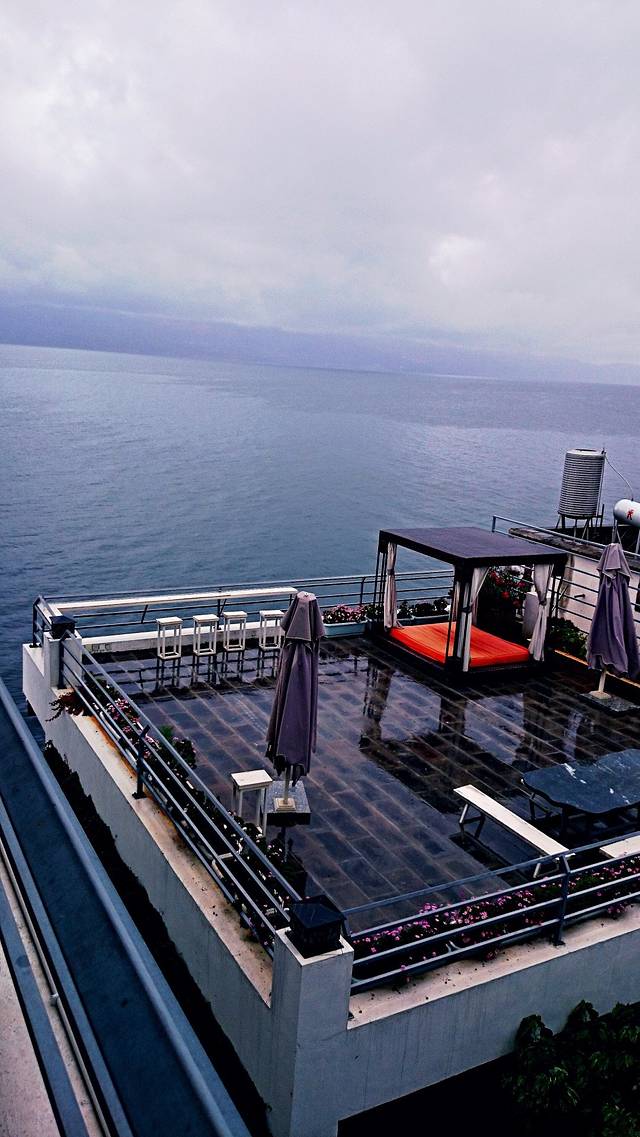 房间二百七十度环海,四周窗帘都可以打开,落地窗前有个大阳台,旁边配有圆形白色浴缸,有些飘小雨,不然马上泡个澡.