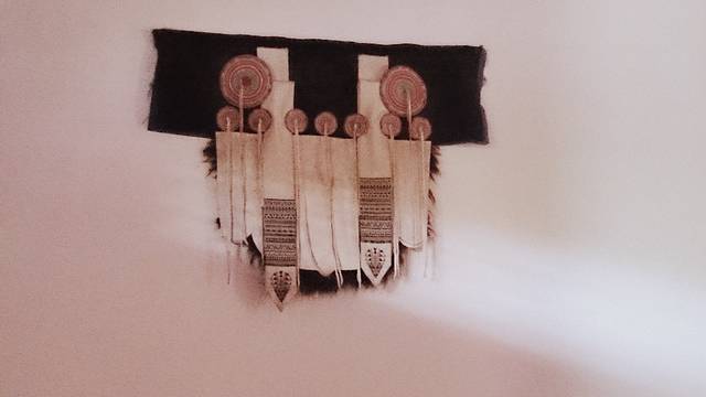 讲解员说这个披肩,是女人出嫁时一定要有的.上边缝着黑边,下面七个彩绣的圆形布盘,圆心各垂两根白色的羊皮飘带,代表北斗七星,象征纳西族妇女早出晚归,披星戴月.
