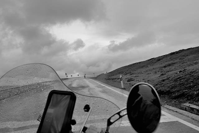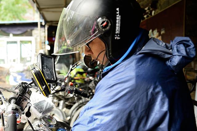 雨不小,车速稍微加一点,便直接打在脸上,又冷又痛,如果拉下面罩,雨水又会大大影响观察,只能半拉下,找个平衡