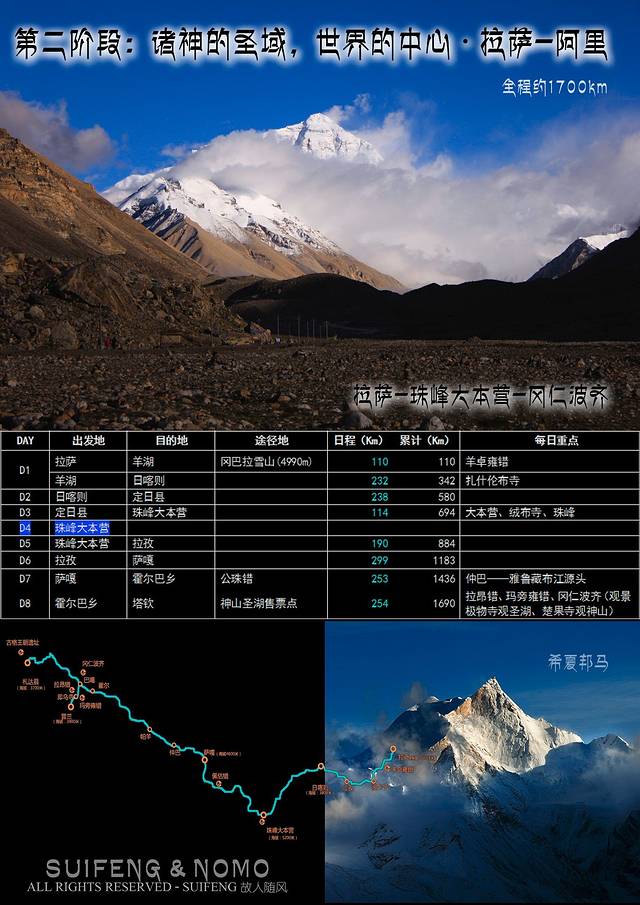 沿着G318\G219进入西藏的核心区域,世界屋脊的屋脊阿里地区,大致行进1700余公里,冈仁波齐、珠穆朗玛峰、希夏邦马峰一座座神山,玛旁雍错、羊卓雍错、佩枯错一个个圣湖,上升至平均海拔4500米以上,这是一条名副其实的天路,最终到达冈仁波齐和玛旁雍错