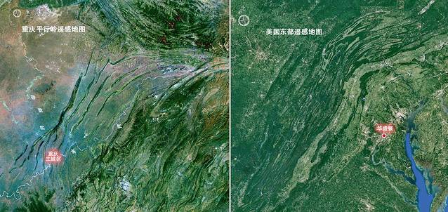 重庆位于图D1-1的右下角,其自然形象很奇特,中国四个直辖市中其他三个可以说在这方面无法与重庆媲美。它是四个直辖市中自然形象最精彩的一个。因为无论重庆全市,还是主城核心区都处在一个非常独特的地质结构之上,这就是平行岭,也叫褶皱山。在重庆境内自西向东,英山、巴岳山、黄瓜山、箕山、云雾山、缙云山、中梁山、龙王洞山、铜锣山、明月山、桃子荡山、东温泉山、黄草山、精华山、铁峰山、方斗山等一条条近似平行的山脉,卫星遥感地图中重庆的样子足以让世人惊叹——几条鲜明的条带状山岭如同纤纤玉手般由东北向西南伸展,实际上这几道山岭是地质构造上说的背斜,是地壳水平运动的结果,这些弧形的山岭正如东南方向一个巨浪推来造成,形成了最具重庆特色的地理景观。下面的两幅地图可以更清楚地看到这样的地质结构,而这一结构在美国华盛顿西北方向的宾夕法尼亚州,也能从高空看到这样的平行山岭,除此之外,恐怕没有再可以与之相媲美的了。