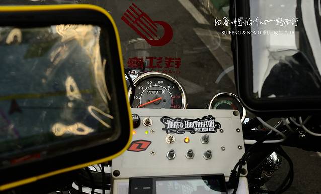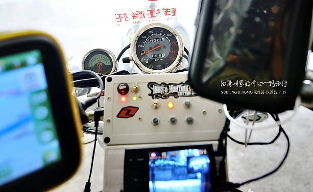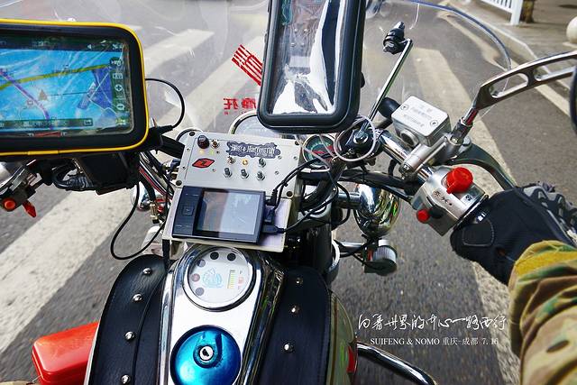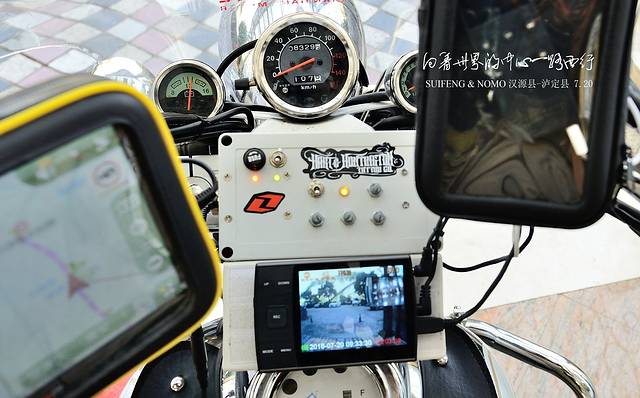 行车记录仪、导航仪、自制的通讯设备直接连接前后座的头盔上的耳机话筒,同时连接无损音乐播放器——听着轻快的音乐,看美景,一路西行,边走边看边听边聊,人生的一种幸福……(由于耳机直接安装在头盔上,所以绝对不会扰民,环保,呵呵呵)