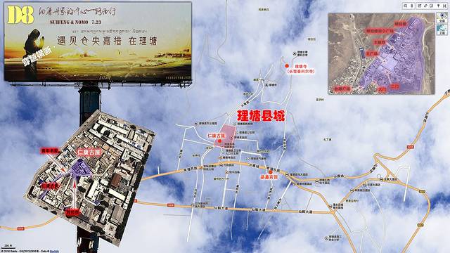 此两处均在理塘县城高城镇内,下面就是它们在县城的具体位置。