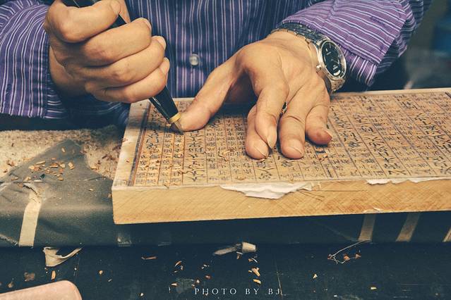 之后书写的纸张会被用浆糊粘到木板上,然后由师傅用专业的雕刻小刀把书写的字一个个雕刻出来,然后便形成了待印刷的一块块雕版。