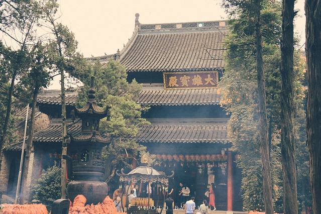 现今的大雄宝殿为清代建筑,面阔三间,前后回廊,檐高三重,漏空花脊。屋脊高处嵌有宝镜,阳有“国泰民安”四字,阴有“风调雨顺”四字。
