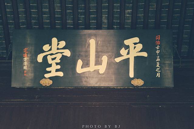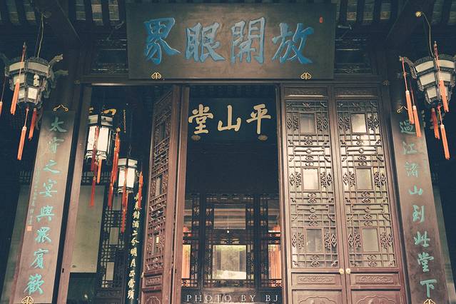 堂前花木扶疏,庭院幽静,凭栏远眺江南诸山,恰与视线相平,“远山来与此堂平”,故称“平山堂”。堂前有联曰:“过江诸山到此堂下,太守之宴与众宾欢”,是欧阳修当年潇洒流运的生动写照。