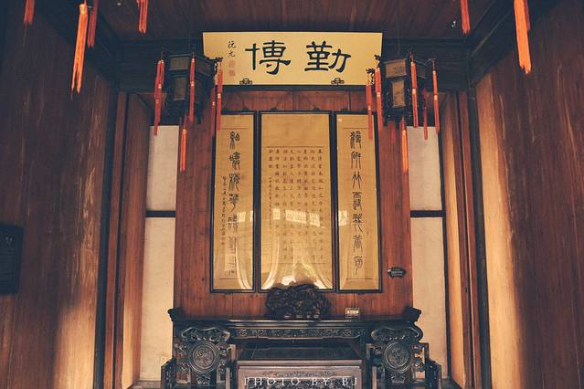 吴氏宅第的“爱日轩”现辟为“吴门四杰”展厅。两侧对联:“夜灯咏史虫吟草;朝几研书獭祭鱼”。意为,朝夕研读,如吟草的昆虫一般的勤奋好学,像祭鱼的水獭一样的问经求典。