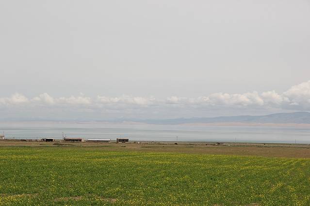 青海湖沿岸星星点点的油菜花,大多数还是小苗苗