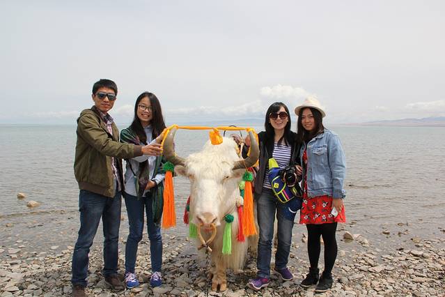 青海湖边,这是以前的老码头,同样可以看青海湖,一个人50元,车直接开到湖边。打扮的很漂亮的白色牦牛,我们也来一张。我们四人小分队终于齐了,唯一的男生,就是所谓的“软妹”,就是我,不过我一直想不通,是谁为什么给我起了这个名字,就凑合着叫吧,大家开心就好。。。。。