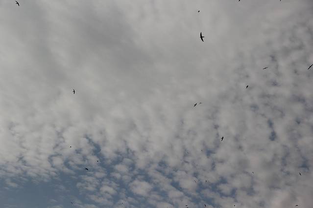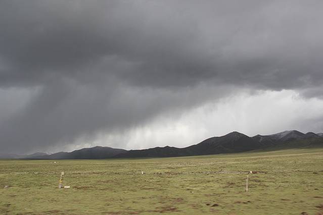 我们驶向乌云区,身后就是蓝天白云,开始下起雨了