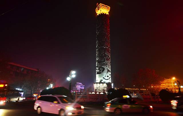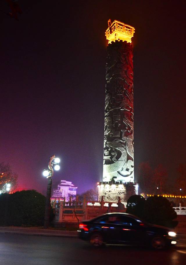 本身这一片就是老城区,一上街就看到已经上灯的“九龙鼎”,那是一个交通环岛,我站在那儿照相第一招人讨厌,第二我也后脊梁发凉。晚上视线不好,可别给我挑那塔上去。