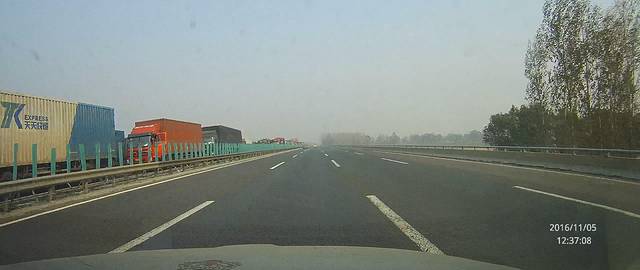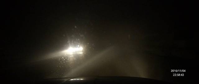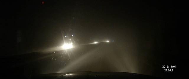 出了市区没有了路灯,浓雾中龟速前行,能见度是这样的: