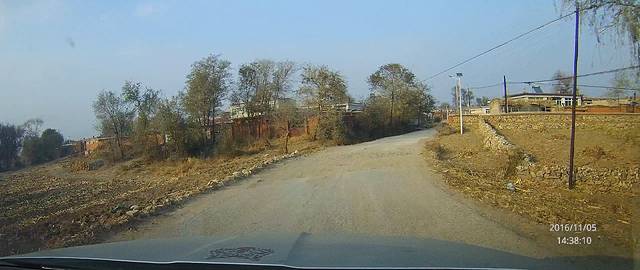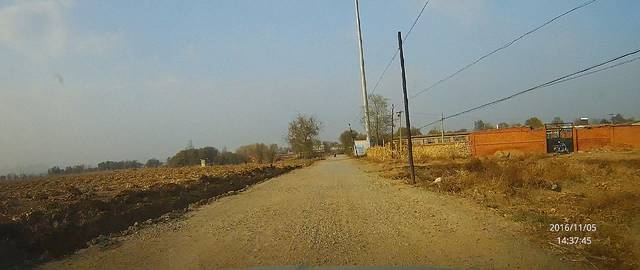 看得见道路右前方的城墙和山头了吗?我远远就感觉这地方倒是有点像。可是道路和“景区”中间有条大河沟子,车子根本过不去,而且没有停车场,而且破烂的大铁栅栏门是锁着的....