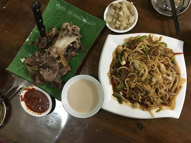 这边的菜主打肯定是牛羊肉,还有奶制品。牛羊肉各种烤羊腿羊排肉串或者手把肉。人少不建议吃烤羊腿,除非有人和你们拼。烤羊排可以弄一份小的。当地的土豆也蛮不错的。点过一次拔丝奶豆腐,开始还好,吃了几个之后真的就太腻了。