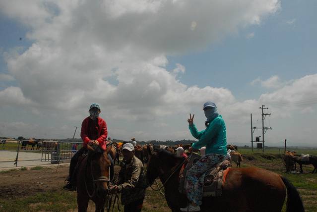 售票处会给一张跑马场的名片说是唯一一家正规的。不过确实也很贵。驯马人牵着马遛半小时100,跑马一次100,登上小山头50一人。旁边的沙地越野车小一点的貌似沙地摩托车一人100/h,大一点可以坐2个人的200/h,还有更大一点的是300/h。最小的那个有劲些,有部分坡双人的爬不上去,即使是在只坐一个人的情况下。