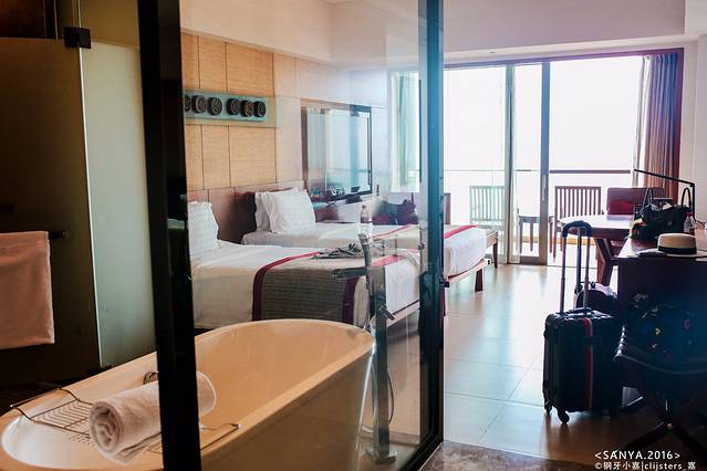 酒店房间的阳台都很宽敞,全海景房阳台正对着三亚湾,海景一览无余。