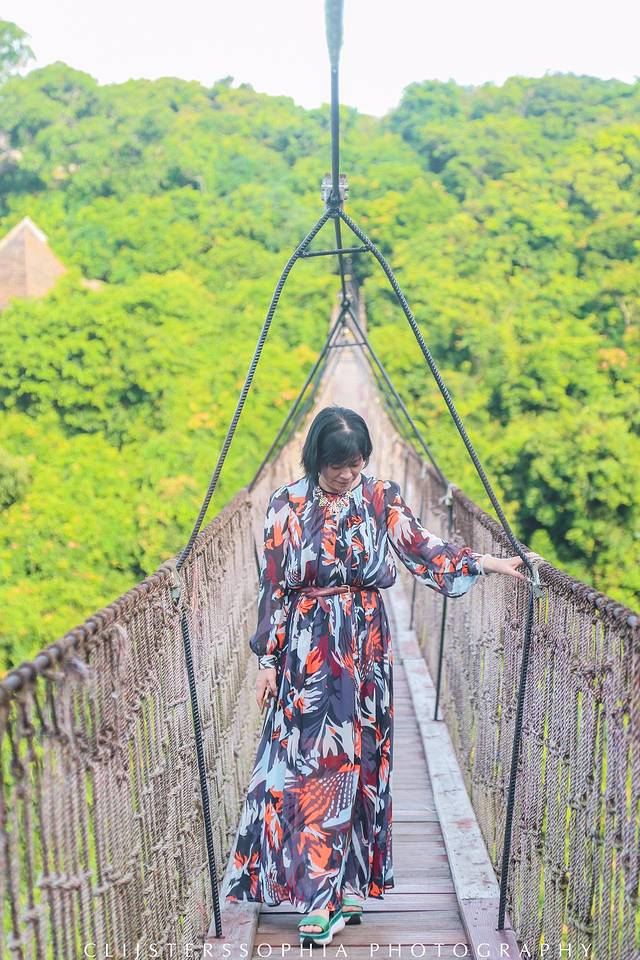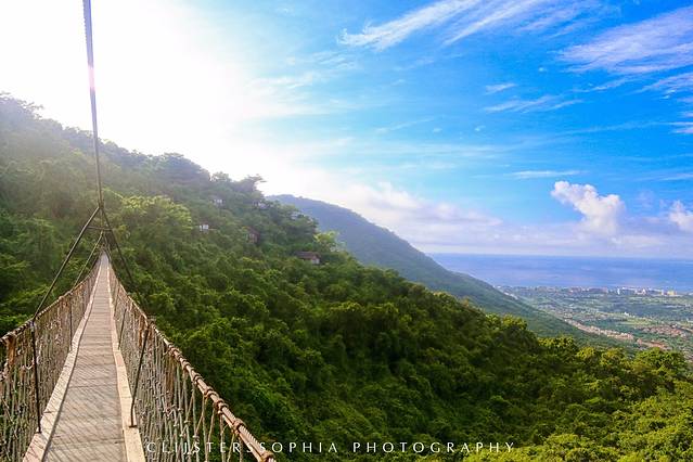 江龙索桥横跨两山之间,是海南目前跨度最长、离地最高的铁索桥,可以想象白天的时候游客必定要排着队过索桥,而现在桥上明显只有我们俩在玩耍。