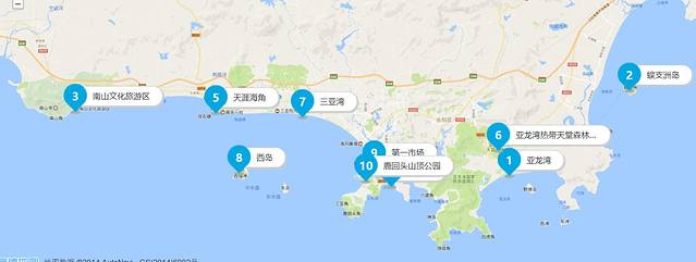 西面景点:南山旅游文化区、大小洞天、天涯海角、西岛