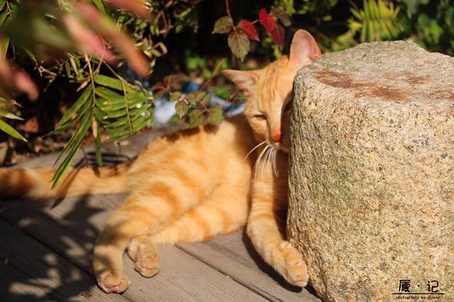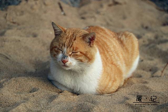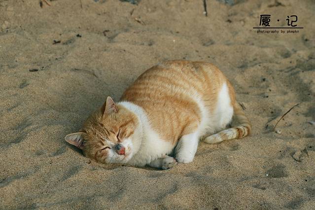 走到大德记浴场时,发现一只窝在沙子里,舒服的揣着小手晒太阳的肥猫,看着就让人好安心。