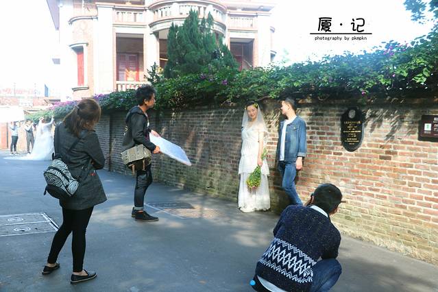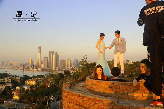 一下午就这么随性的走着,发现周边的人越来越少,一看地图,到了笔山公园。准备往回走时,发现边上有条小路,想着反正到了,过去看看有啥吧。没几步走到尽头,在尽头的树木边转身一看,一架简易的梯子搭在一块巨大的岩石上,上面已经有十多个人在等候着太阳下山。没错,这里也有拍婚纱照的新人后来才知道,当地人把这里叫做“月光岩”,是鼓浪屿上第二高处,是一处不为人知的观景好去处!