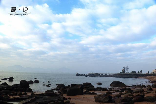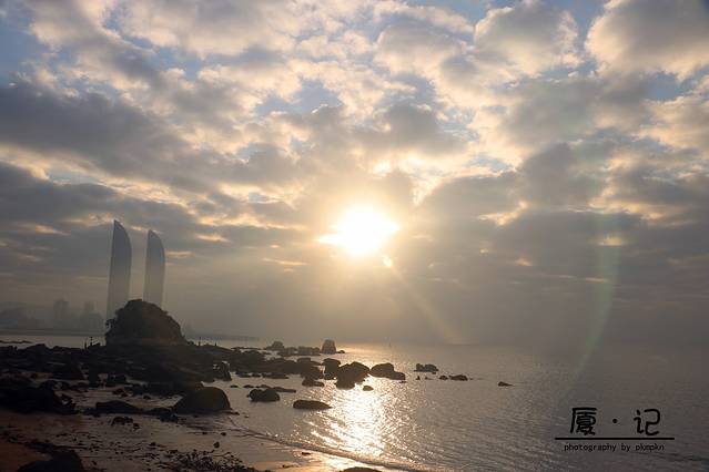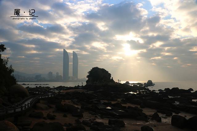菽庄花园进不去,日光岩又被我安排在了下午,于是转道沿着海岸线,朝着皓月园方向前进。没想到也因此看到了日光穿透云层,洒在海上的美景。