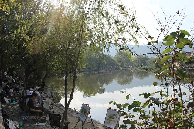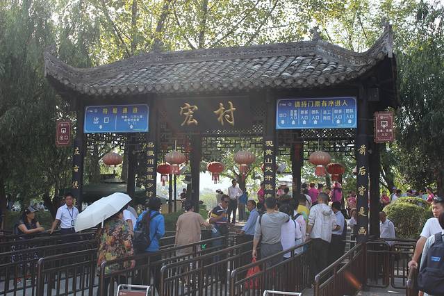 这两棵大树是这牛形村的“牛角”,宏村的“风水树”,也是一种吉祥的象征。树下乘凉、休息的人真不少。