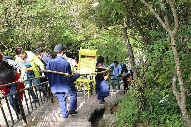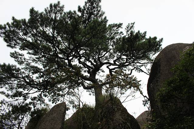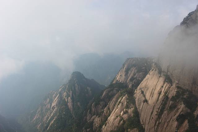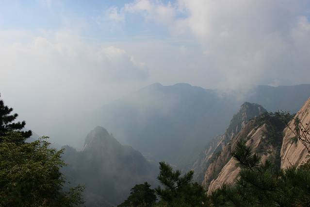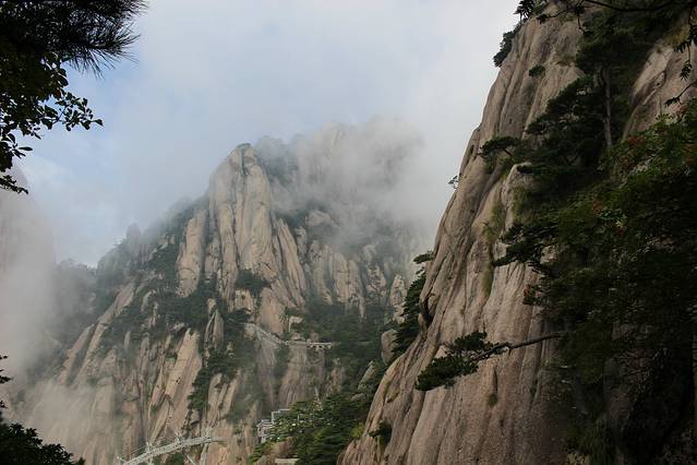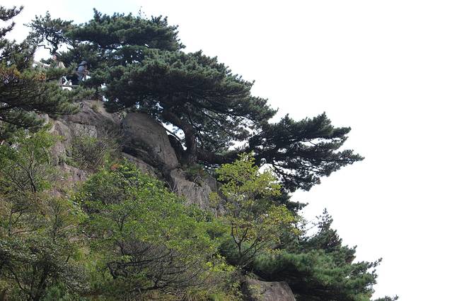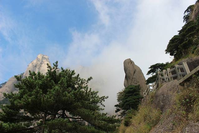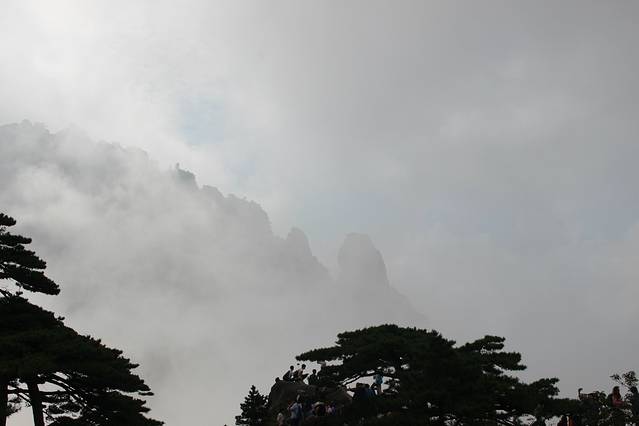俗话说,逢山见庙,黄山却是唯一一所没有千年古刹的山。没有香火,有的只是美景。坐玉屏索道,十分钟不到就到了半山腰,由于能见度太低,我们也只能欣赏近在咫尺的 云雾萦绕的黄山松了。四周白茫茫 的一片,好像腾云驾雾一般。 “抬头看雾,低头看路;左右看树,前后看客”此言不假。