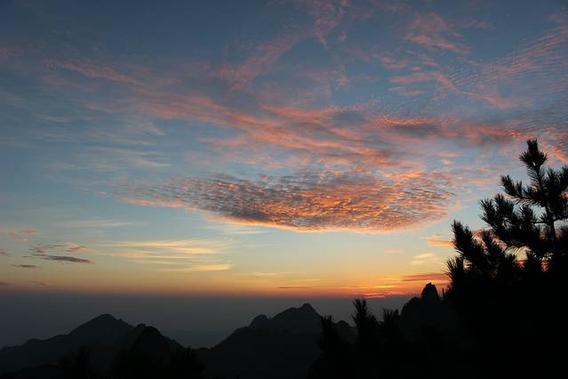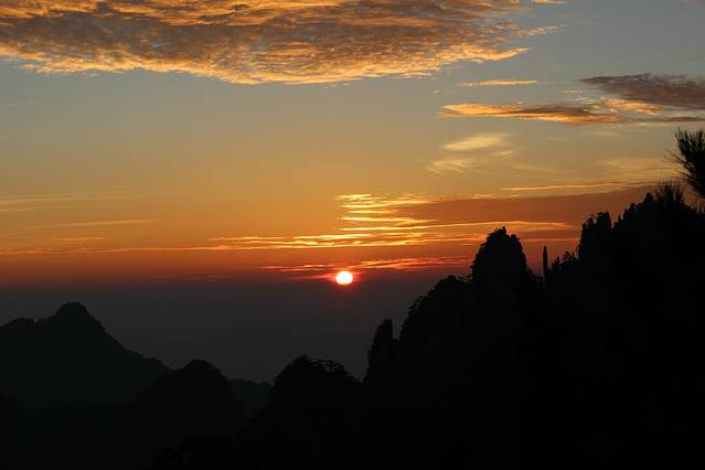 起床,赶紧前往狮子峰占位置,要知道人很多的,去晚了就什么也看不见了。 东方的天际边已露处一丝鱼肚色霞光,我开始准备好相机,每隔几分钟按下快门,大自然巍巍壮丽景色,使我这个久居城市之人,内心感受到一次强烈的震撼!那挺拔矗立的山岚、那飘逸起伏的云海、那霞光万道的天穹,让我看得如痴如醉,久久不能忘怀!