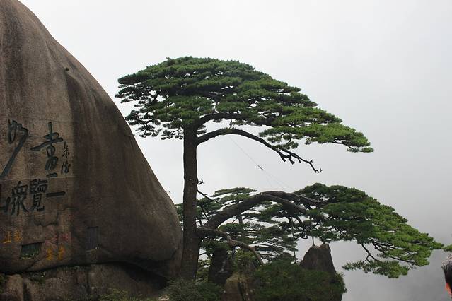 下了索道,浓雾东升,隐隐约约中可见山峰耸翘,林壑幽深,让人心扉洞开。拾阶而上,穿过白云梯,我们来到闻名中外的黄山第一松——迎客松。导游告诉我们:迎客松在文殊洞顶,松破石而出,形态优美,为十大名松之首。作为千古闻名的风景名胜,少不了文人墨客的题字。苍劲有力的大字,平增了不少人文气息。