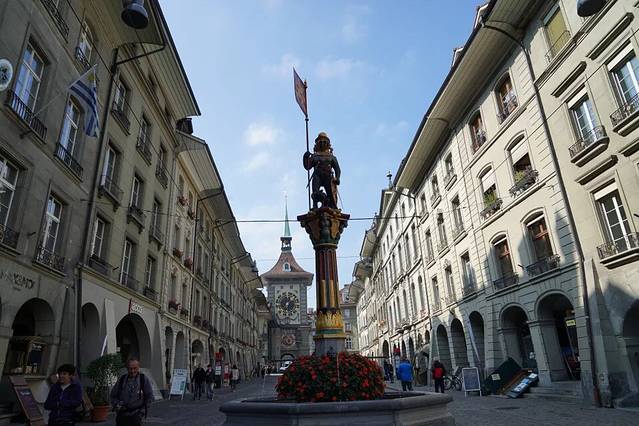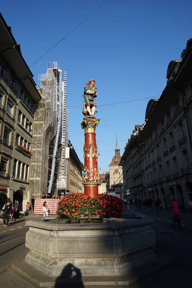 6.查宁根喷泉(Zhringerbrunnen):这个喷泉是为纪念伯尔尼城的命名人来自Zhringen(查宁根)的Berchtold五世而修建的。描绘了一只穿着盔甲的熊,脚下踩着一只熊幼崽,坐落在克拉姆街(Kramgasse)著名的大钟楼(Zytgloggen)东边。
