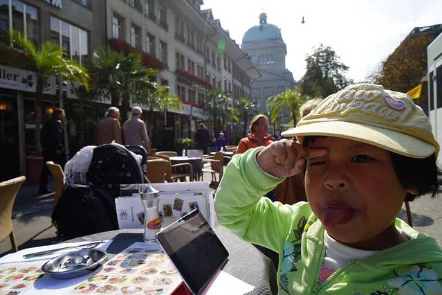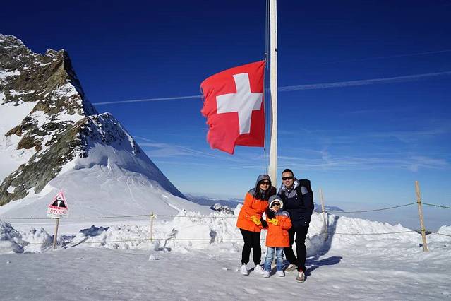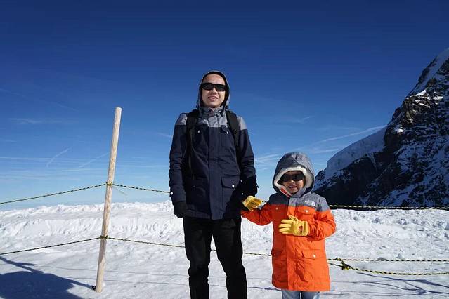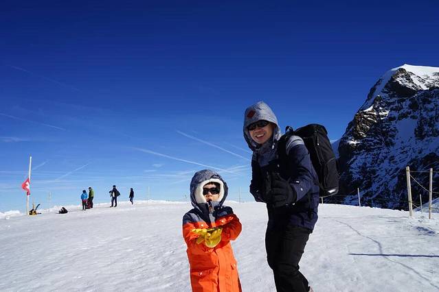这是此程最贵的景点,半价双程火车票都要CHF 90一人,还好小孩6岁以下免费…… 天公作美艳阳高照让我遇见了最美的阿尔卑斯,墨蓝的天空衬上皑皑白雪,美得让我激动不已。不过因为小屁孩觉得不大舒服所以我没来得及玩遍所有的项目,例如参观lindt工厂,冰上皇宫 但,此情此景,我已经很满足了~ 爽!