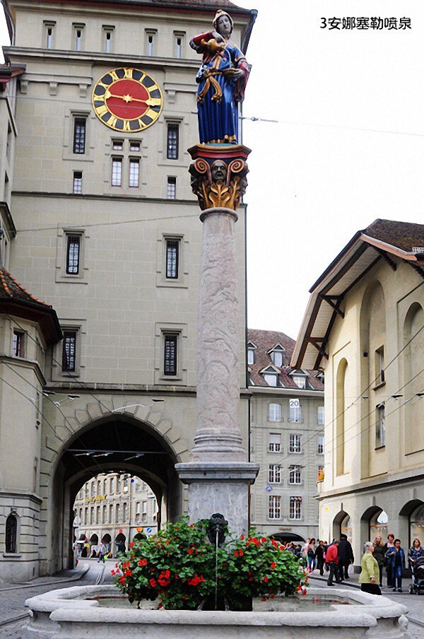 3.安娜塞勒喷泉(Anna-Seiler-Brunnen):安娜塞勒是伯尔尼小岛医院(Inselspital)的组建人。为了纪念她安娜塞勒喷泉(Anna-Seiler-Brunnen)建在马尔克特大街(Marktgasse)上