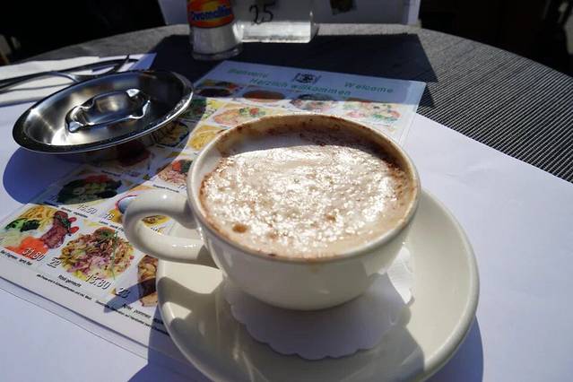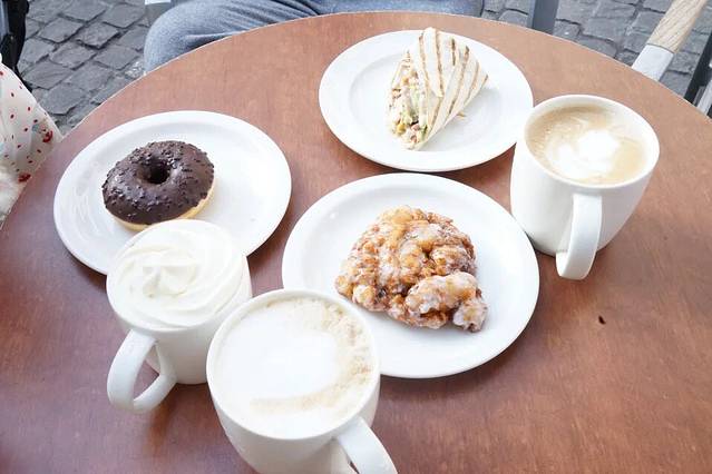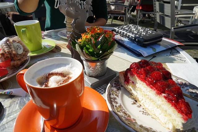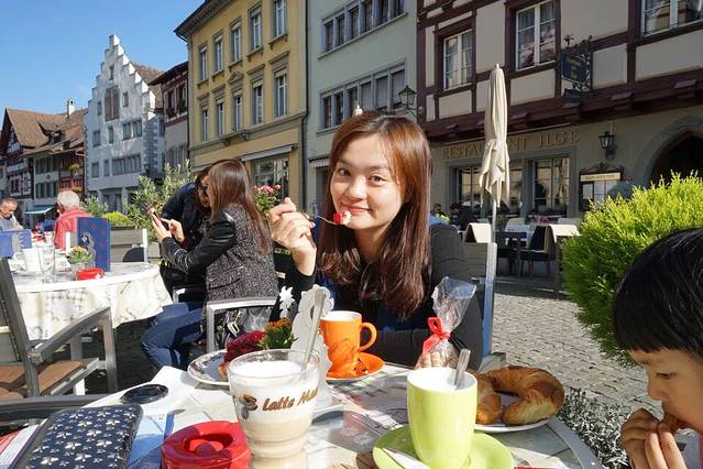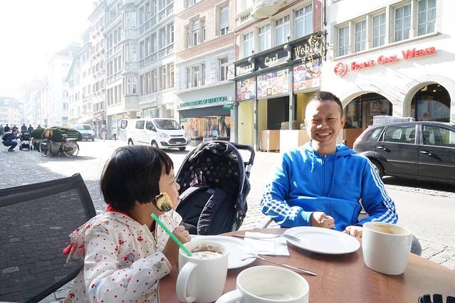 欧洲人真的很喜欢阳光,而的确没有阳光的地方实在是有点寒风刺骨的感觉~ 由于酒店不包早,所以要一早出来觅食,在户外咖啡厅吃了块高颜值的草莓蛋糕,是不是很诱人?! 不但样子好看味道也很赞哟~ 在瑞士这些天真的天天都离不开咖啡…… 原本在广州就已经是喝得很频繁了来到这里就是变本加厉!