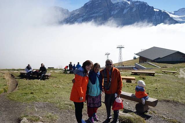 临时决定的行程 -- Balchalpsee... 坐缆车上到First 然后徒步约一小时才能到达~ 原本觉得闲庭信步慢悠悠地晃过去就可以了,结果却是跋山涉水风吹日晒饥寒交迫地爬过去的…… 如果只是大人还好了,但是小屁孩走了一会儿就开始闹脾气说不走了,还好有小狗Karful吸引了她的注意力让她屁颠屁颠地跟着跑,才能顺利到达~ 雪山上的一泊湖水,一眼万年。看到人们都带着食物来野餐而我们三就只有一壶热水,顿时整个人都不好了……