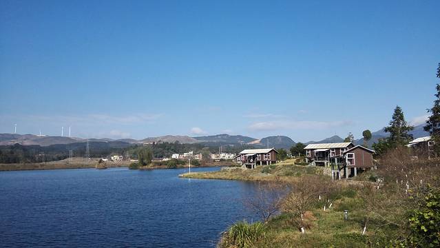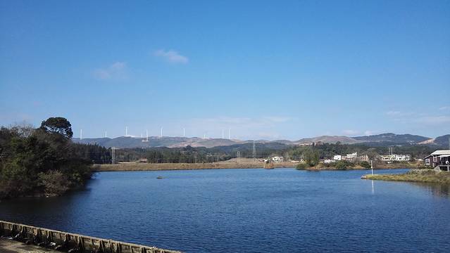 大峡谷的出口,大布河蜿蜒而过,河水清澈秀气,让我想到了远在彩云之南的洱海,远处还有大风车。