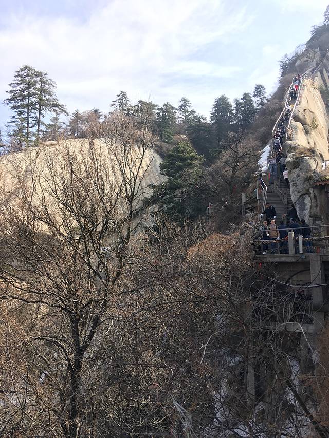华山没有黄山的上上下下的台阶,也不像泰山那样一条比较平坦开阔的路,华山虽然海拔很高,但路并不是很长(iPhone步数),也从侧面反映出华山之险。可能因为时间的关系,华山的绿化不是很好,道路两边没有成片绿荫,有的只是萧瑟的枝条,也就是说:在宽1米不到的台阶两旁,你是能看到悬崖峭壁的,无尽的深渊也造就了一幅壮观的景象。也许你会害怕2333,但除了极个别的地方,其他的路还是挺好走的,在千尺㠉和百尺峡的前面,有一条较为平缓的岔路,可以从那边绕行~
