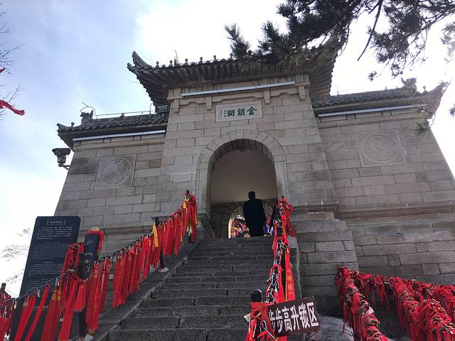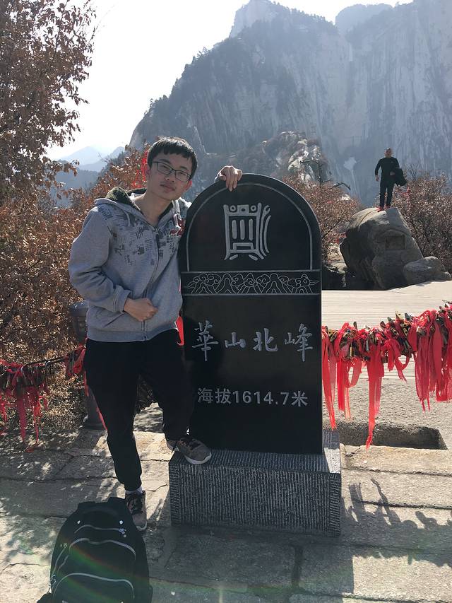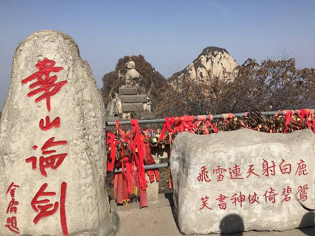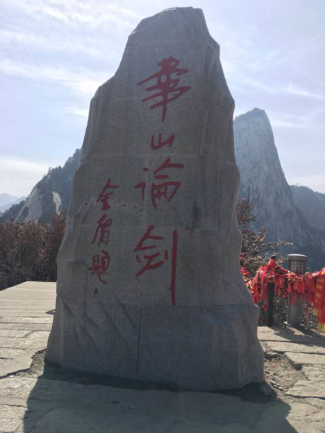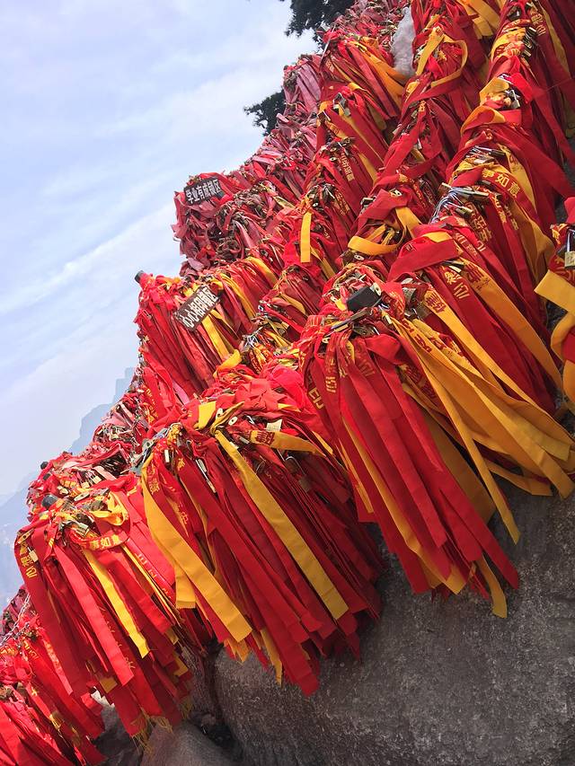过了这两个后后面的路就比较好走了,大概花了3个小时左右,我们来到了北峰顶(中峰和东峰没有海拔的石碑。。),海拔石碑旁有金庸华山论剑的碑,拍照的人很多,其实后面的路上还有很多、、从白云峰到金锁关是一道漫长的路,我们走走停停,原来山上过夜看日出日落的计划也变成了当日坐缆车下山,路上有卖锁的,5元一把是最低价,可以刻名字日期啥的挂在金锁关那里,我挂了两把,有缘人可以去找找看2333。