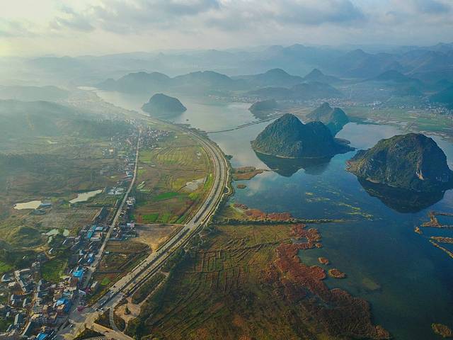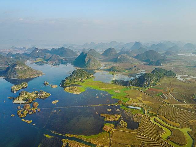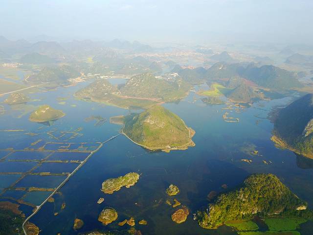 航拍的照片,三百六十度自由飞翔。在空中看看普者黑湖和散落其中的孤峰、水田、鱼塘。