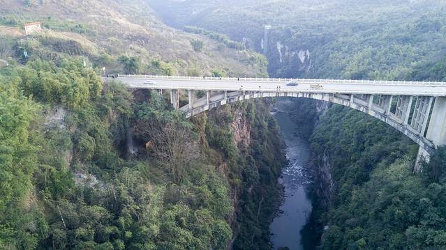 航拍的马岭河峡谷和国道上的峡谷大桥