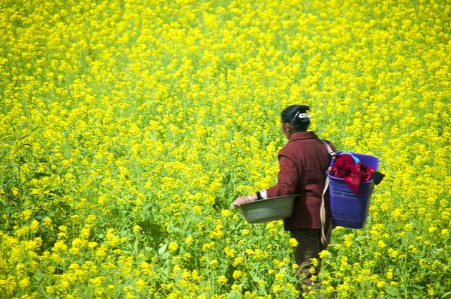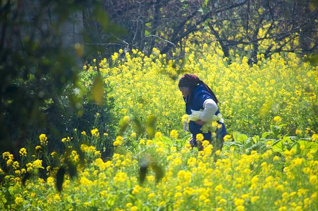 油菜花田间摘菜的布依族老奶奶