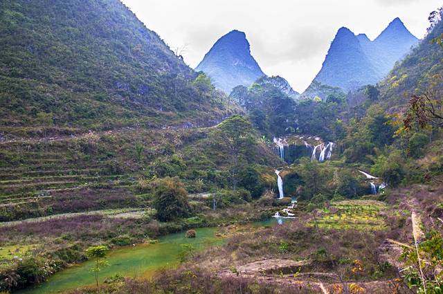 从德天出口下高速,沿着黑水河畔的316省道行驶不远,就到了三叠岭瀑布,去年来的时候,在德天瀑布耽误了行程,以致这段备受好评的美丽省道走的是夜路,什么都看不到。所以这次不去德天瀑布,直接走省道,寻找靖西几个有名的野瀑布群。