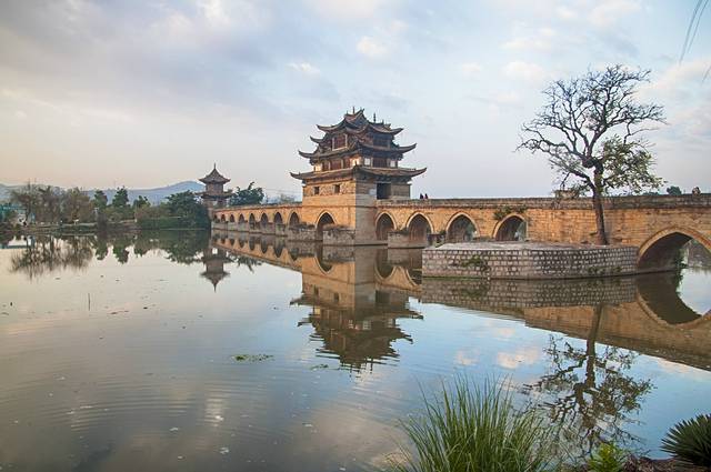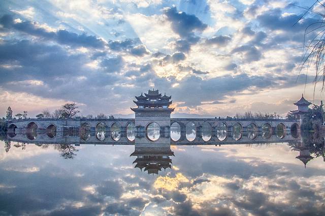 双龙桥坐落于建水古城的城西5里处,是座三阁十七孔大石拱桥,所以又被称为十七孔桥。横跨泸江与塌冲河交汇之水面上,所以根据一桥锁双龙的寓意而得名。已列入中国造桥史册。
