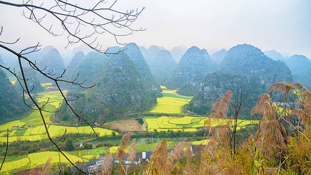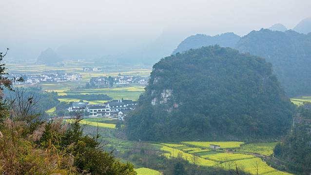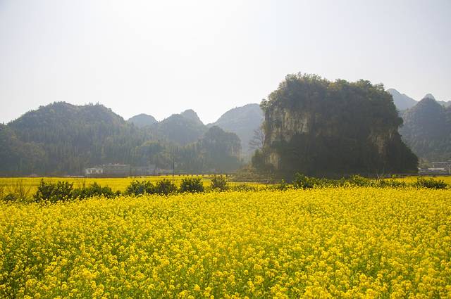 春天的万峰林和夏天是完全不一同的景色。峰林之间绿油油的稻田变成了金黄的油菜花田。但在山上看下面的油菜花,显得没那么金黄,也许是盛花期刚过,也许是这白朦朦的雾气影响了光照。显得颜色比较暗淡。